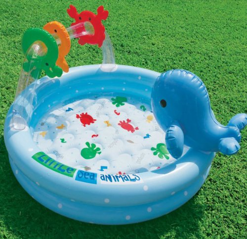 35.5" x 21", made of 10 gauge vinyl. Comes with 3 rings and inflatable toys. 15 gallon capacity