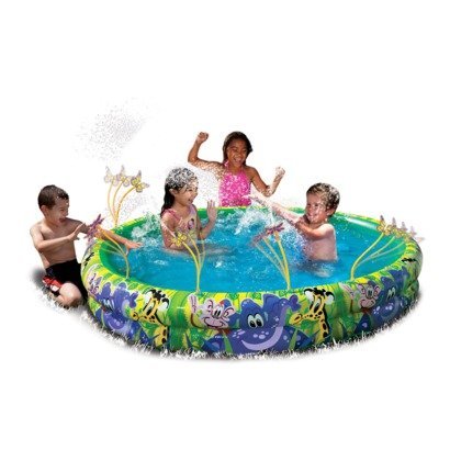 Take a break from the warm, summer weather and cool off with this Banzai jungle pool. This colorful pool is specifically designed for children, but adults will also enjoy dipping their toes in the water. The jungle animal design will spark your child's imagination, and the Spray 'N Splash action is sure to provide hours of enjoyment for the whole family. The Spray N' Splash Jungle Fun Lagoon Pool is two activities in one - splash and play in the refreshing animal designed lagoon pool or soak up the sprinkles from the wet 'n wild water wigglers! It's a cool jungle adventure in your own backyard. Features: *Silly wiggling butterfly and drangonfly sprinklers *54 in diameter x 10 in height inflatable pool *Connects to any garden hose *Durable PVC construction *For ages 2 years and up Product Specifications: *Number of Air Chambers: 2 *Recommended Capacity: 3 People *Water Depth: 8 in *Includes: Repair Patch *Frame Material: Plastic *Estimated Set-Up Time: 10 minutes *Liner: Material: Plastic *Capacity Total Volume: 208 Read more...
